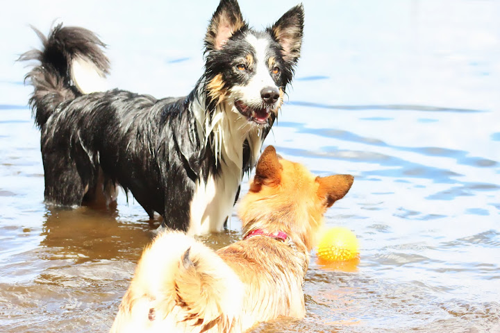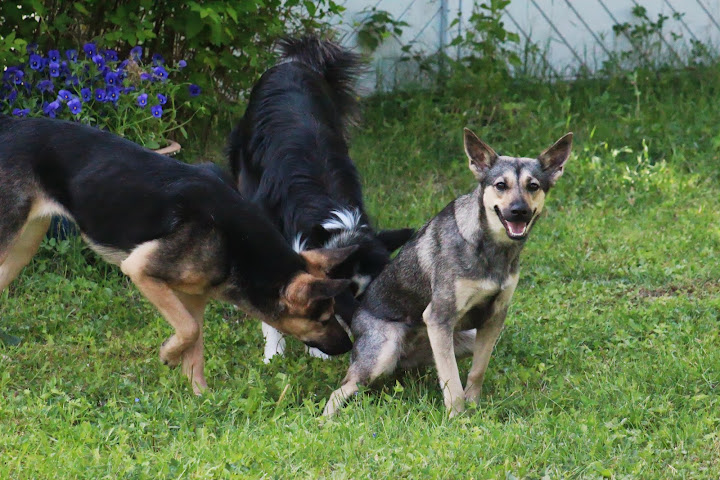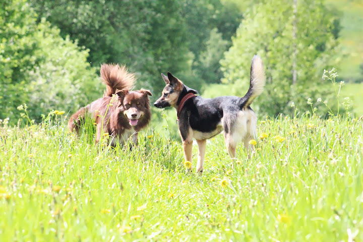 Tänään Soppa pääsi vuorostaan juoksuttamaan Pimua mun mittaiseen heinikkoon ja rallien loppuun käytiin vielä vähän pulikoimassa.