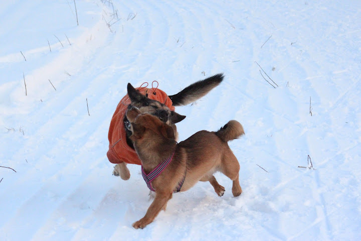 Ja eilen sillä aikaa kun Soda vietti aikaa leikkauspöydällä, kävi Linka ralluuttamassa Pimua, sitä samaa jonka kanssa Bella peuhasi useampaan otteeseen. Linka oli taas melkoinen hirmuakka, eikä Pimu selvästi ollut yhtään varma tuleeko siitä ateria vai ei. Kyllä ne kuitenkin hyvät rallit sai aikaan :>| Minä pieni pentu tässä vain, älä syö.. |