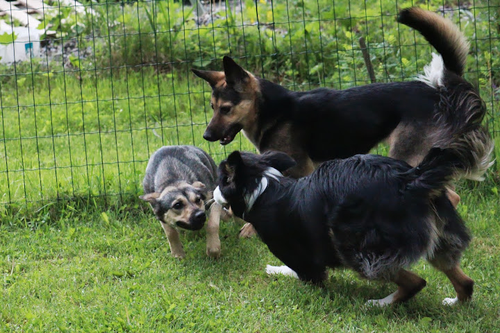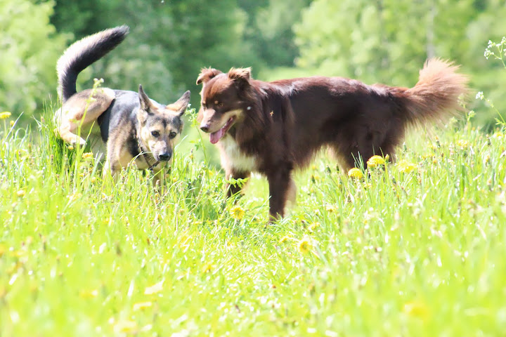 Tänään Soppa pääsi vuorostaan juoksuttamaan Pimua mun mittaiseen heinikkoon ja rallien loppuun käytiin vielä vähän pulikoimassa.